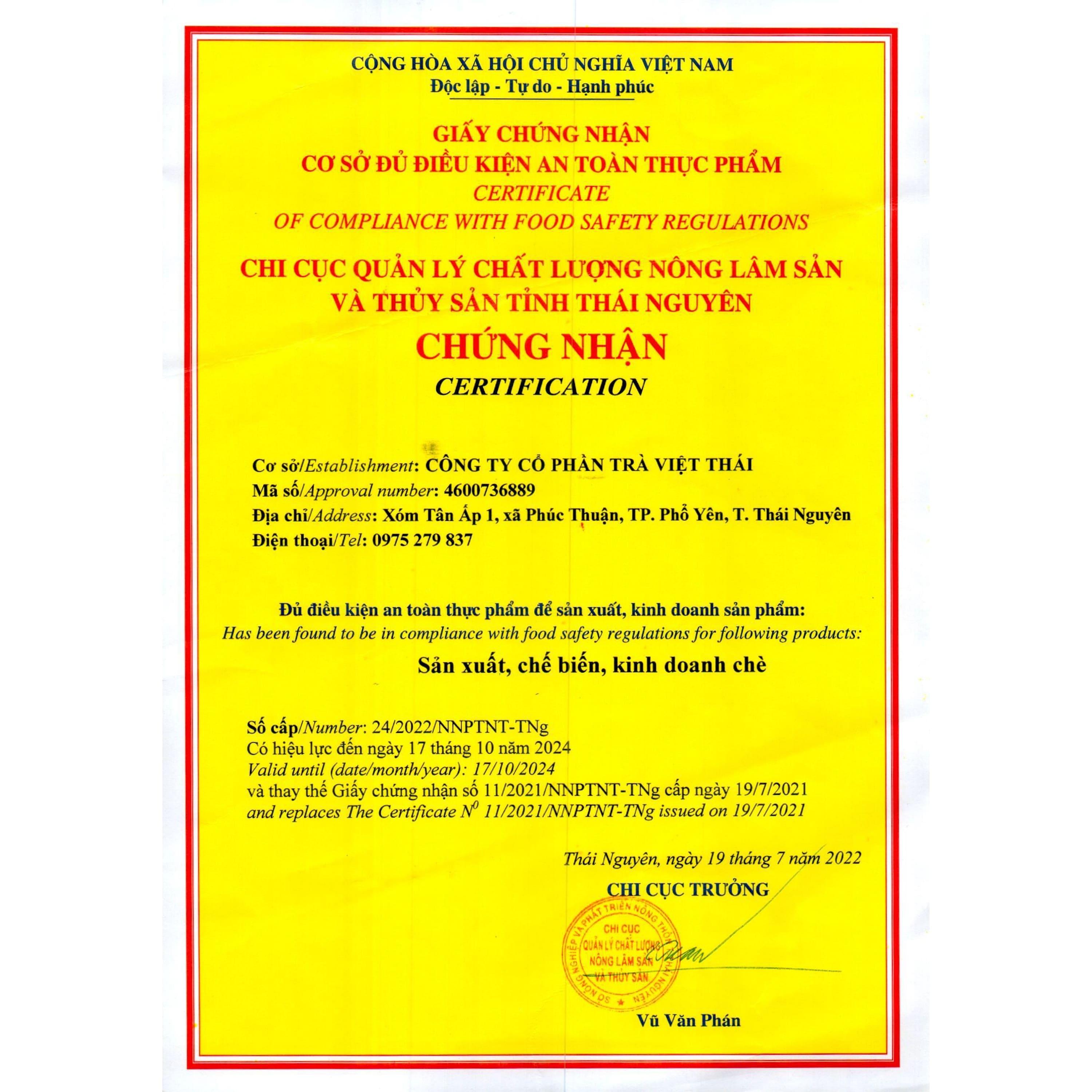 - Sản phẩm được thu hái từ vùng nguyên liệu thương hiệu Việt Thái trồng và chăm sóc theo hướng hữu cơ và đạt tiêu chuẩn VietGAP. Đồng thời sản phẩm đã được kiểm nghiệm hàm lượng thuốc bảo vệ thực vật, phân bón hóa học và các chất độc hại khác, đạt 27/27 chỉ tiêu ATVSTP.